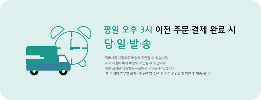 - 배송 기간 : 1일 ~ 3일 / 주말 및 공휴일 제외 / 평일 오후 3시 이전 주문 시 당일 출고 (재고 소진 시 별도 안내)