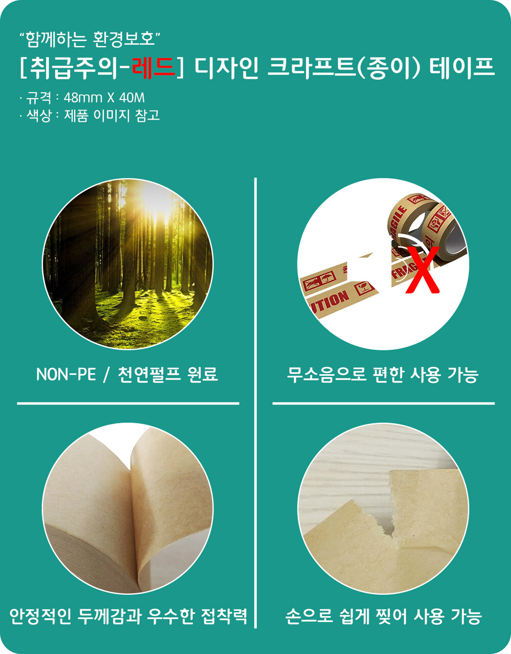 [취급주의-레드] NON-PE 디자인 크라프트 테이프(48mm*40M) 1개